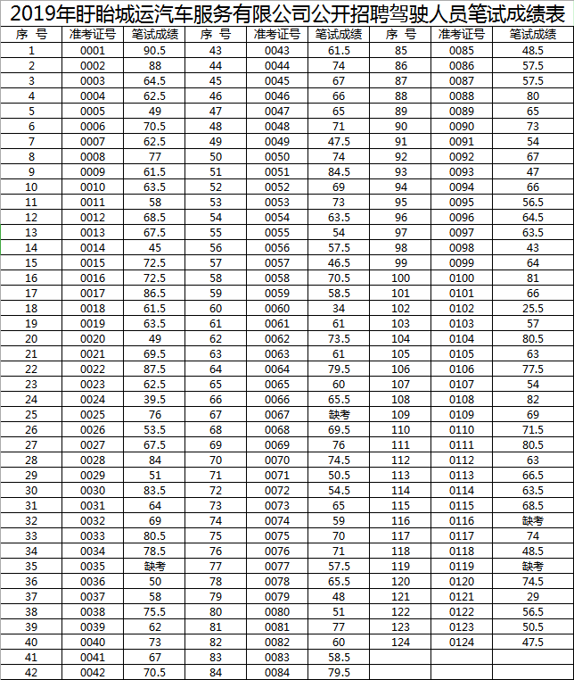 2019年盱眙城運汽車服務有限公司 公開招聘駕駛人員第1號公告 2019年盱眙城運汽車服務有限公司公開招聘駕駛人員筆試已于2019年9月10日結束,現將考生的筆試成績予以公布。 特此公告。