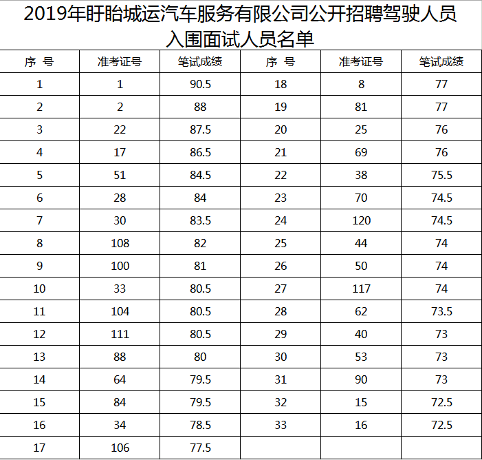 附件:2019年盱眙城運汽車服務有限公司公開招聘駕駛人員入圍面試人員名單。