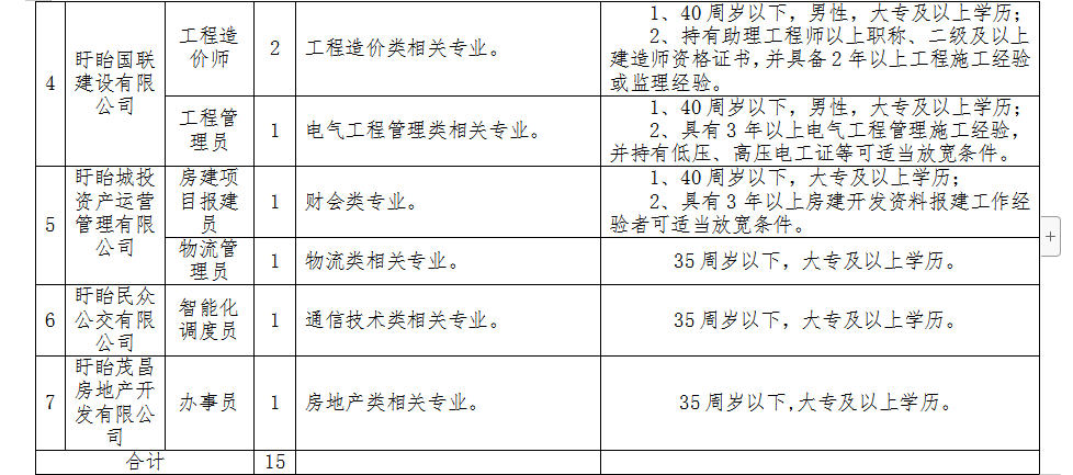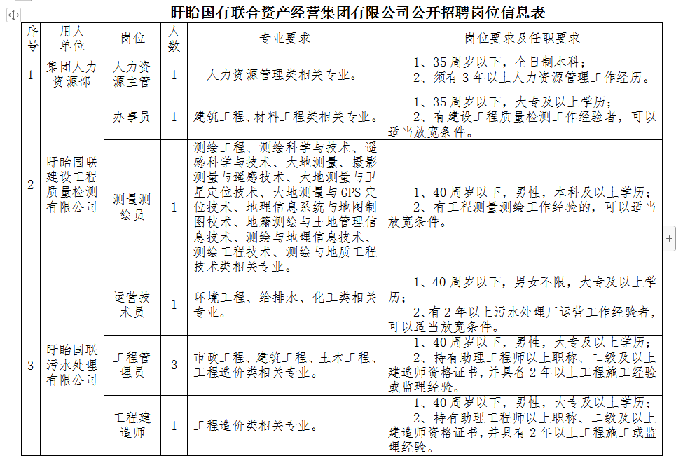 本次招聘具體崗位及條件詳見《盱眙國有聯(lián)合資產(chǎn)經(jīng)營集團(tuán)有限公司公開招聘崗位信息表》(附件1)。
